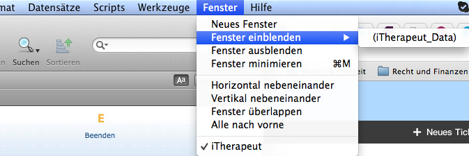 - Gehen Sie ins Menu "Fenster" ganz oben am Bildschirmrand, wählen dort "Fenster einblenden" --> "iTherapeut_data..." (siehe Bild 2)