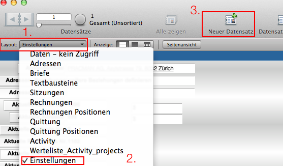 - Falls Punkt 1 korrekt ist, prüfen Sie, wie viele Datensätze Sie in den Einstellungen haben. Das sehen Sie anhand der Zahl in der Nähe des Buchzeichens im äusseren grauen Bereich. Hier sollte die Zahl 1 (Gesamt) stehen (siehe Bild 1). Falls hier 0/1 Datensätze steht, gehen Sie wie folgt vor: