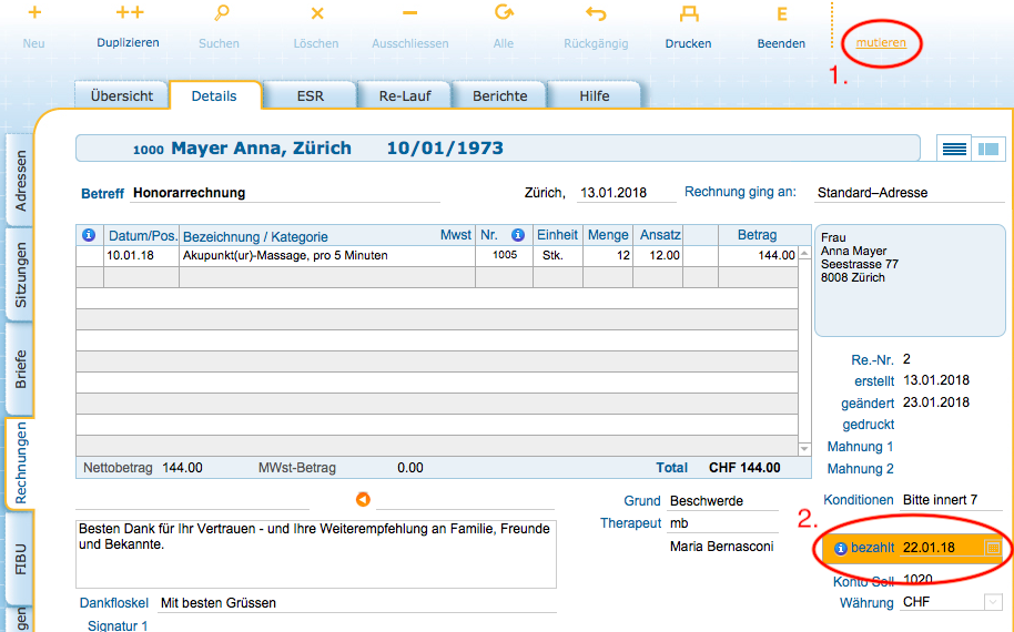 1. Um die Rechnung zu ändern/löschen, klicken Sie oben rechts auf "mutieren" (siehe Bild). Die Rechnung wird entsperrt. Sie bestätigen, dass Sie die Rechnung mutieren wollen und löschen das Bezahldatum im unteren gelben Bereich.