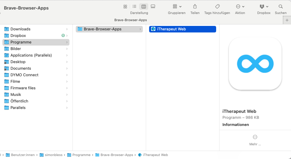 Im Finder können Sie die App auch später aus dem Ordner „Brave/Chrome Apps“ per Drag & Drop in das Dock ziehen.