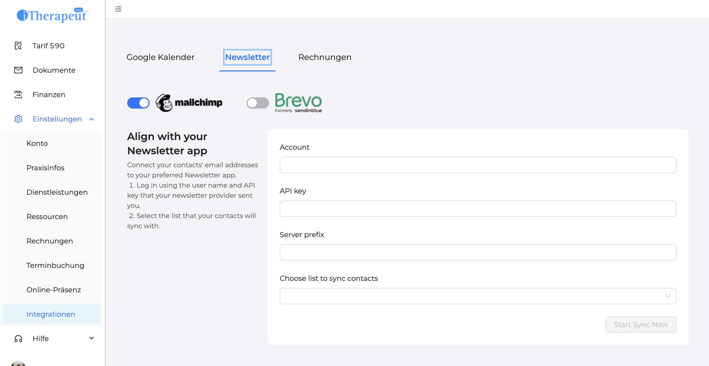Schritt 3: Wähle zwischen Mailchimp oder Brevo aus und fülle die entsprechenden Felder aus. Die nötigen Informationen findest du bei deinem Newsletter-Provider. Wähle die Mailingliste aus, in welche deine Kontakte von iTherapeut synchronisiert werden sollen.