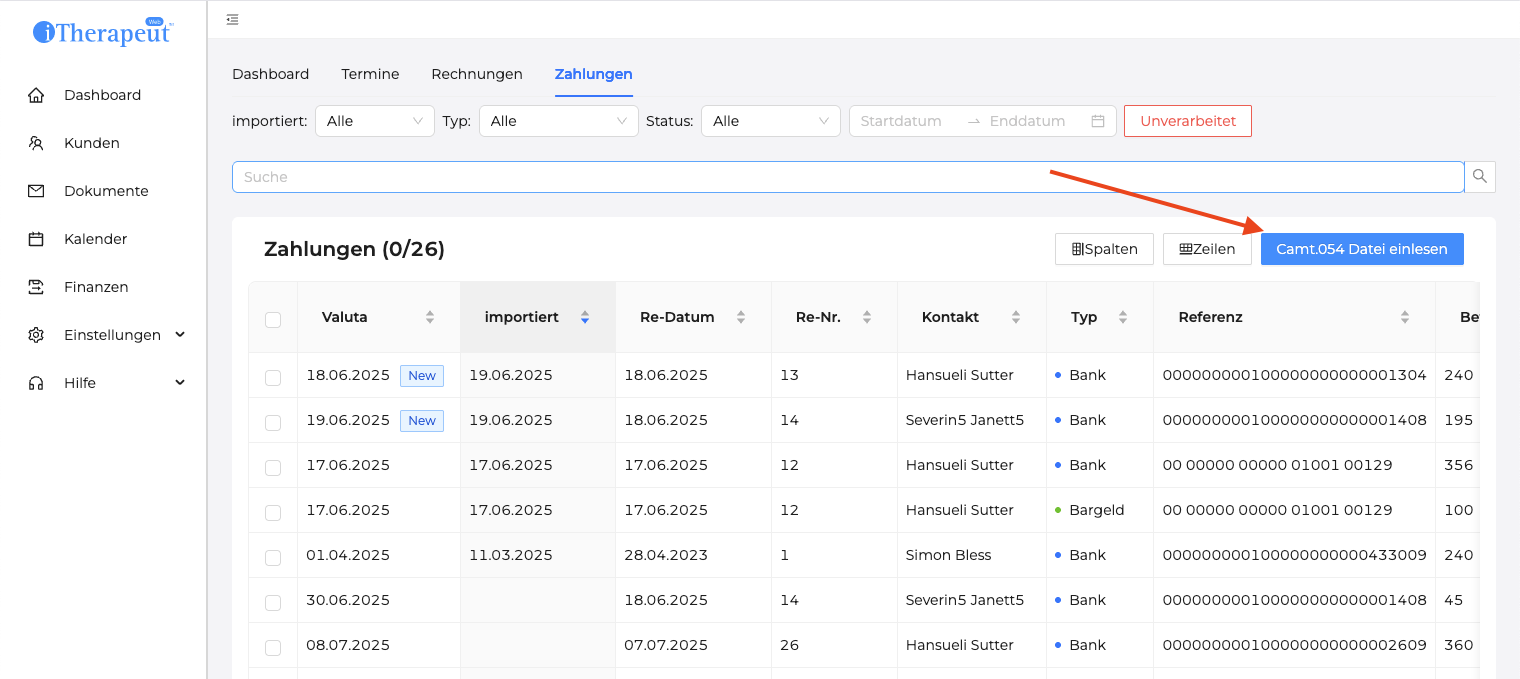 Schritt 3: Drücke oben recht auf den "Camt.054 einlesen" Knopf (im Bild roter Pfeil).