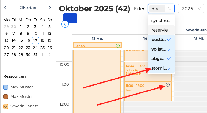 Falls du auf dem Kalender den Filter für Stornierte Termine noch aktiv hast (Häkchen gesetzt), zeigt der Kalender die gelöschten Termine weiterhin an. Der Status ist dabei ein kleines schwarzes X. Um die gelöschten/stornierten Termine nicht mehr auf dem Kalender anzuzeigen, öffnest du die Filterliste und deaktivierst den Filter "Storniert". Klicke danach erneut in den Kalender.