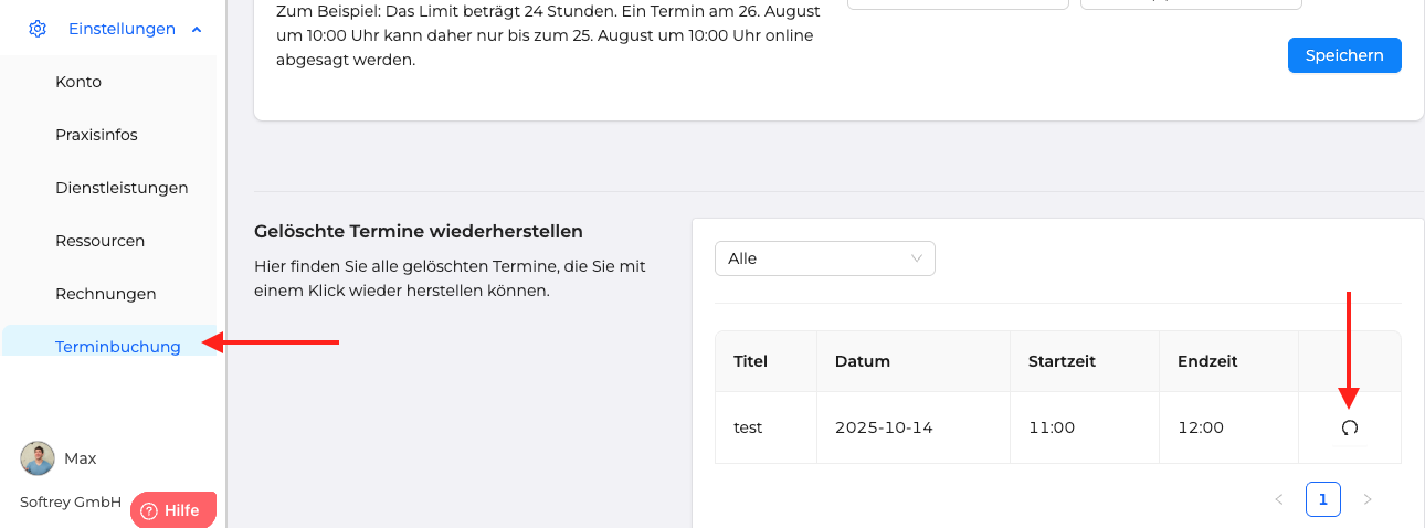 Den gelöschten Termin findest du sodann unter Einstellungen - Terminbuchung. Hier kannst du einen fälschlicherweise gelöschten Termin auch wieder "zurückholen" in den Kalender, indem auf das kleine Kreis-Icon klickst.